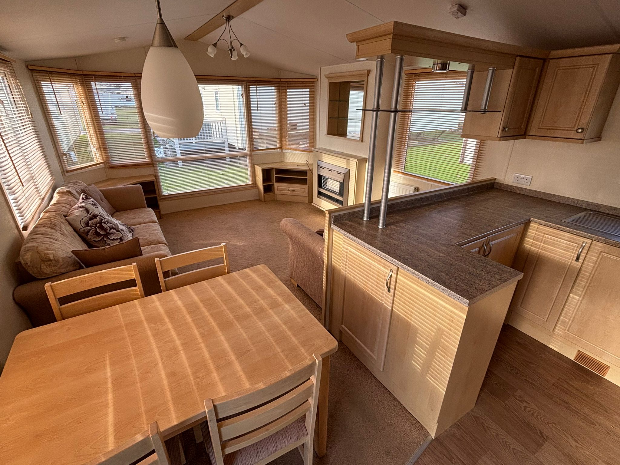 The bright open-plan lounge, kitchen and dining area creates a sociable space where everyone can unwind together. Large windows fill the area with natural light, while comfortable sofas and a fireplace make it ideal for cosy evenings. The kitchen offers plenty of storage and worktop space, plus gas hob, oven and room for essential appliances. A freestanding dining table is perfect for meals or entertaining.
