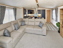 Front opening doors would open out delightfully on to a decking (not included) and they give an airy and open feel to the space. L-shaped seating provides comfortable seating for the family around the entertainment unit which has space for a 55″ TV. The sofa will also fold out into a double bed, which is great for having additional family or friends staying over.