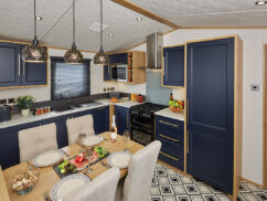 The striking kitchen has indigo cupboard fronts, with stunning gold-effect handles, a resin grey sink and a glass splashback. From a practical perspective, you can enjoy the convenience of an integrated dishwasher, microwave and fridge-freezer, meaning you can enjoy more time relaxing.