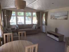 Inside, the lounge area has two fixed sofas, seating 2 and 3 people, one of which has a fold-out occasional bed. They are comfortable and provide a great space to enjoy spending time together whether you are watching your favourite TV show or film. There is a stylish electric fire and a low level entertainment cabinet.