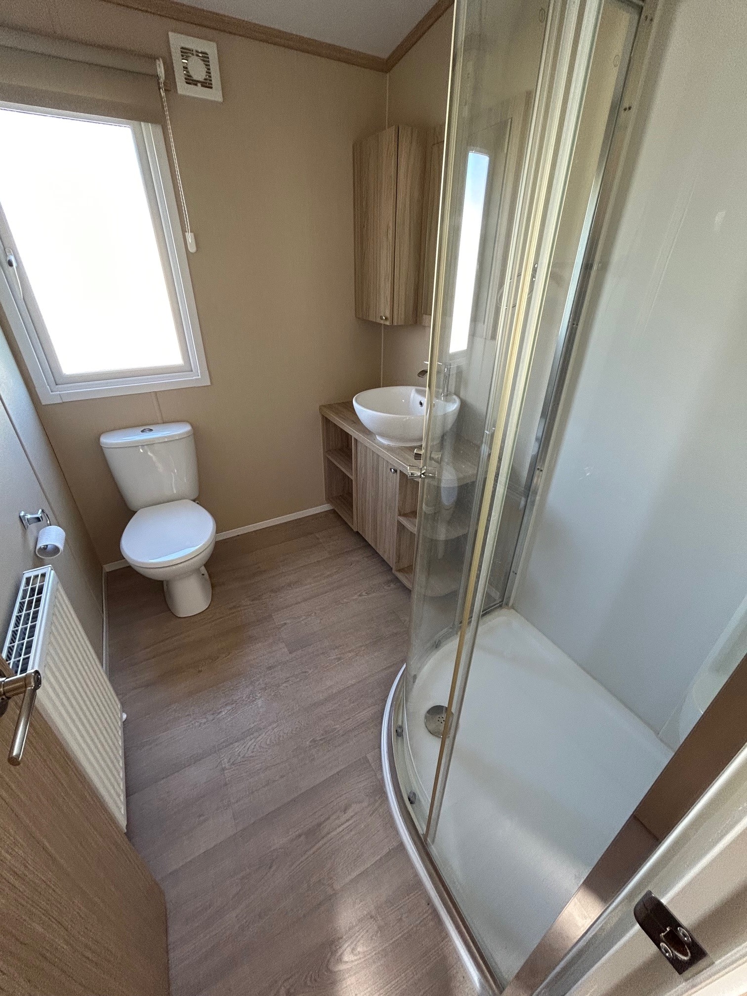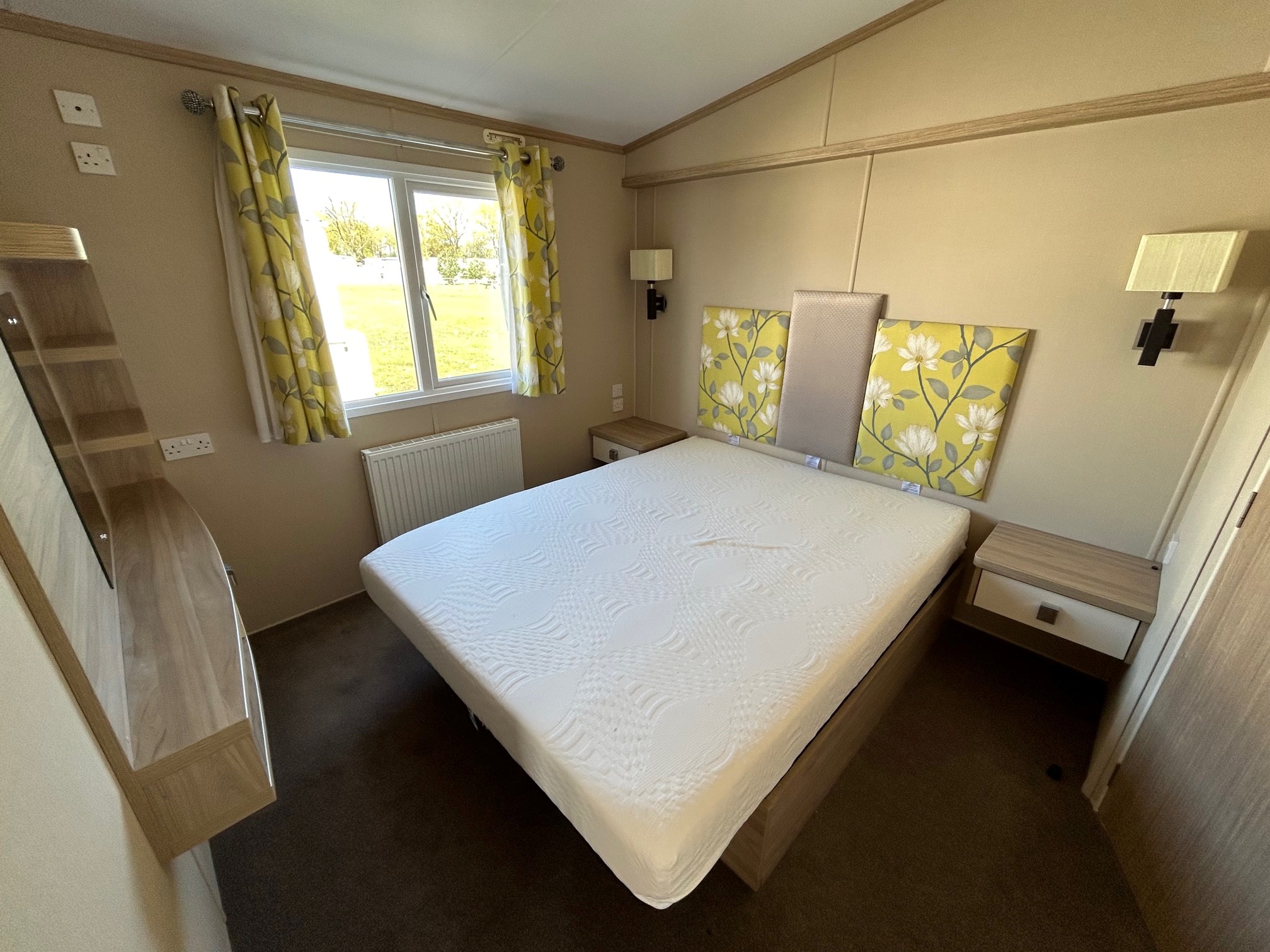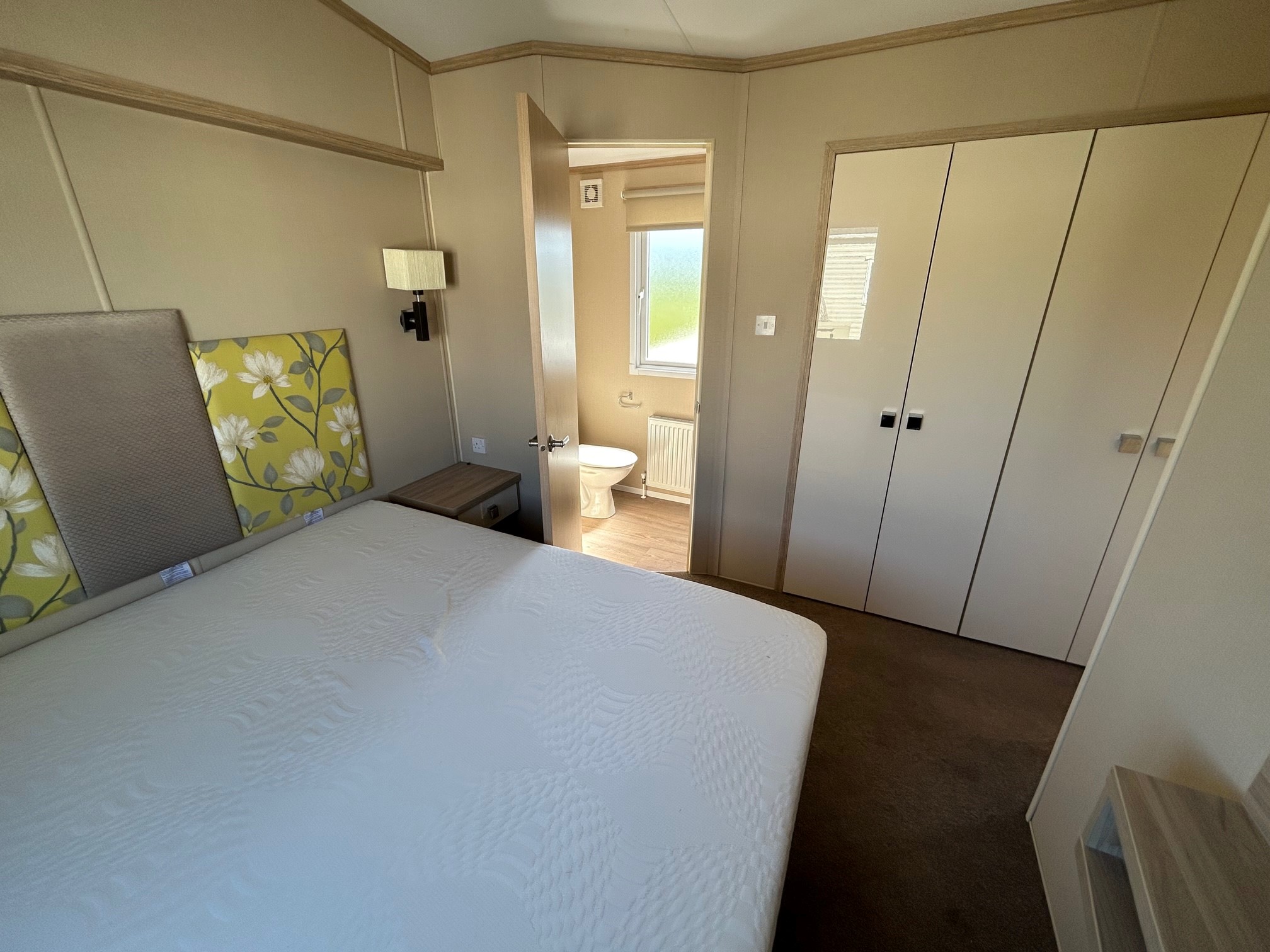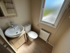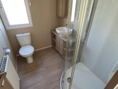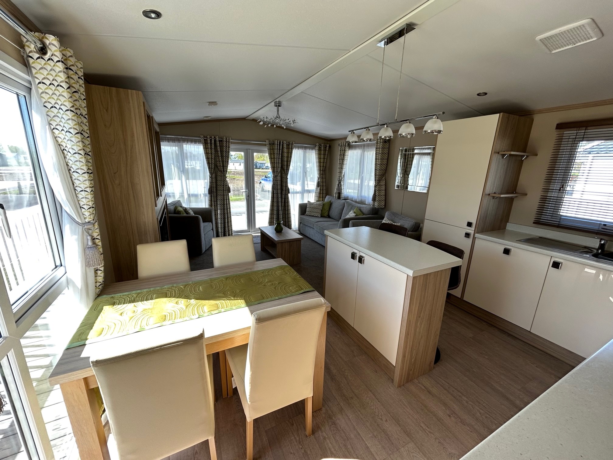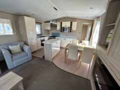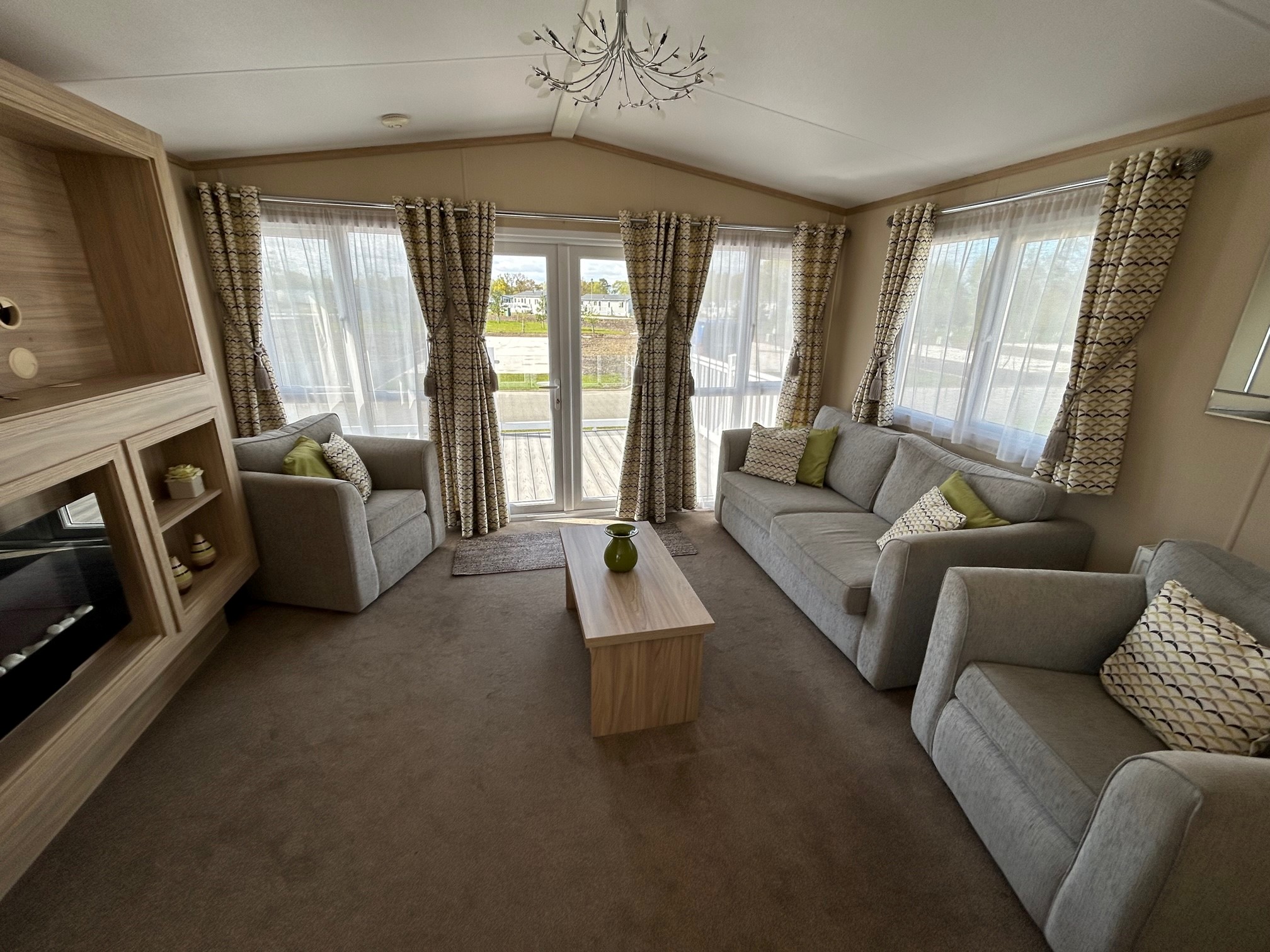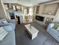 Front opening doors in the lounge open onto the decking area and provides light and a lovely breeze into the holiday home. With a grey sofa and two matching armchairs, there is ample space for the whole family. The sofa and chair faces the electric fire and bookshelf area where you can place your TV and other personal ornaments.