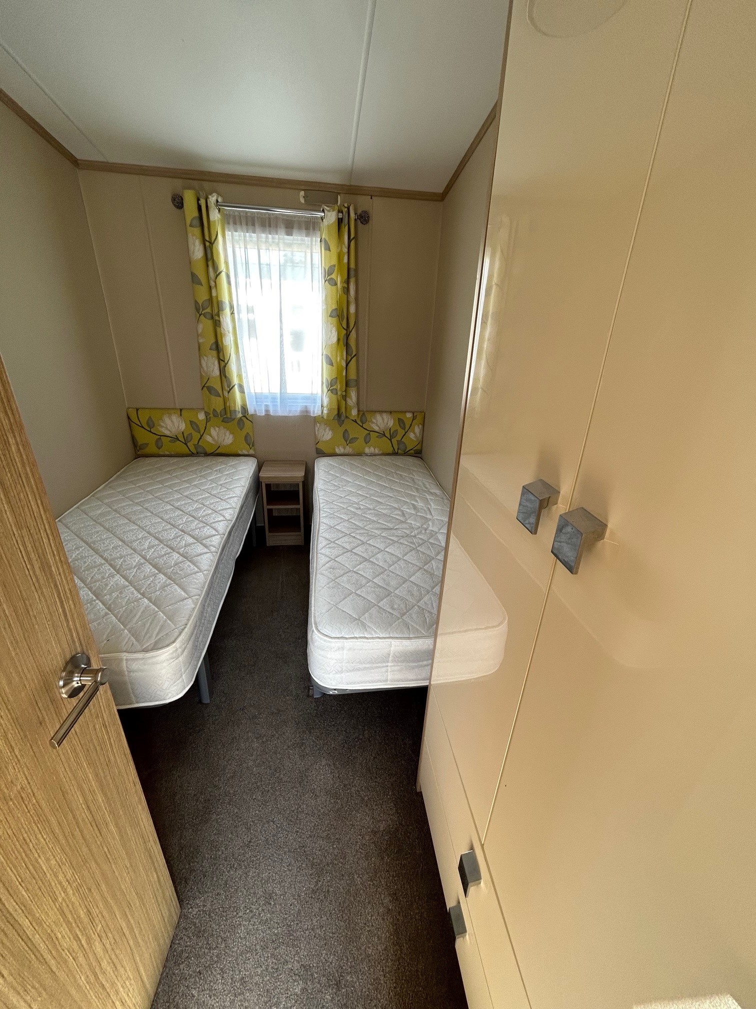 The twin bedroom has matching feature headboards and a wardrobe.