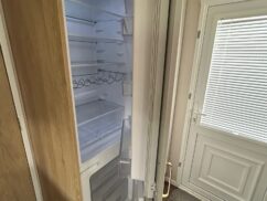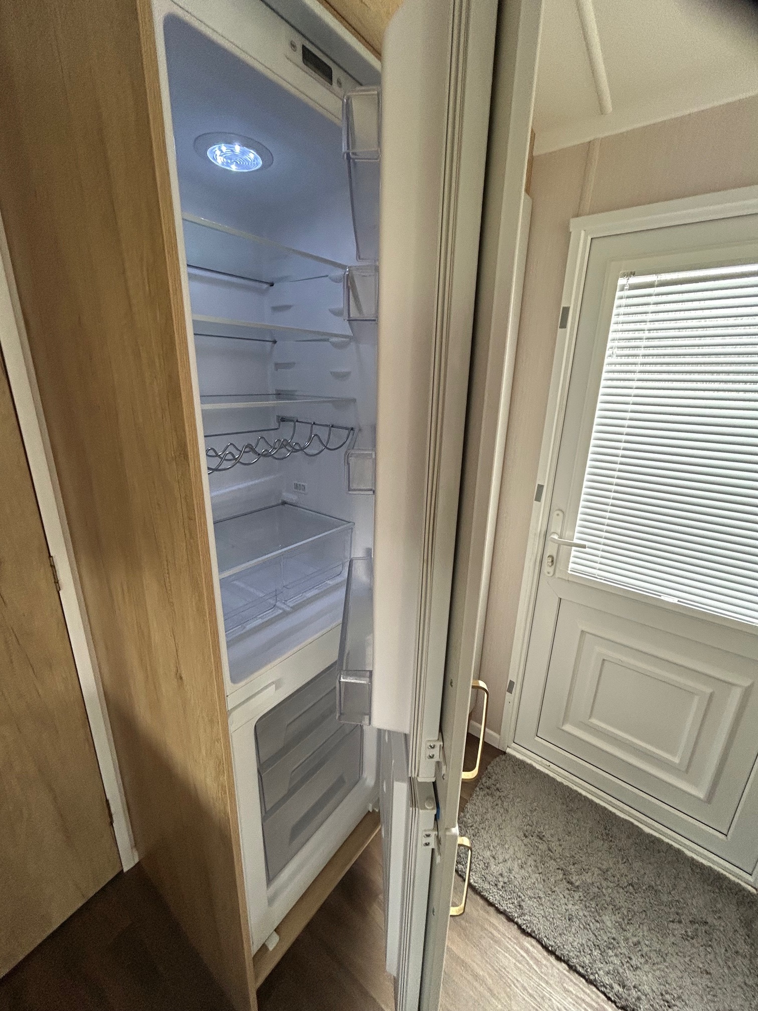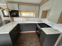 The U-shaped kitchen provides ample space for preparing your food with 40mm laminate worktops and upstands. There is plenty of cupboard space which has a soft close mechanism and the 4-burner gas hob has a stainless steel overhead extractor. There is an integrated fridge-freezer opposite the main kitchen area, plus a free-standing dining table and chairs.