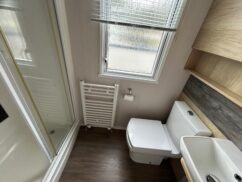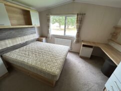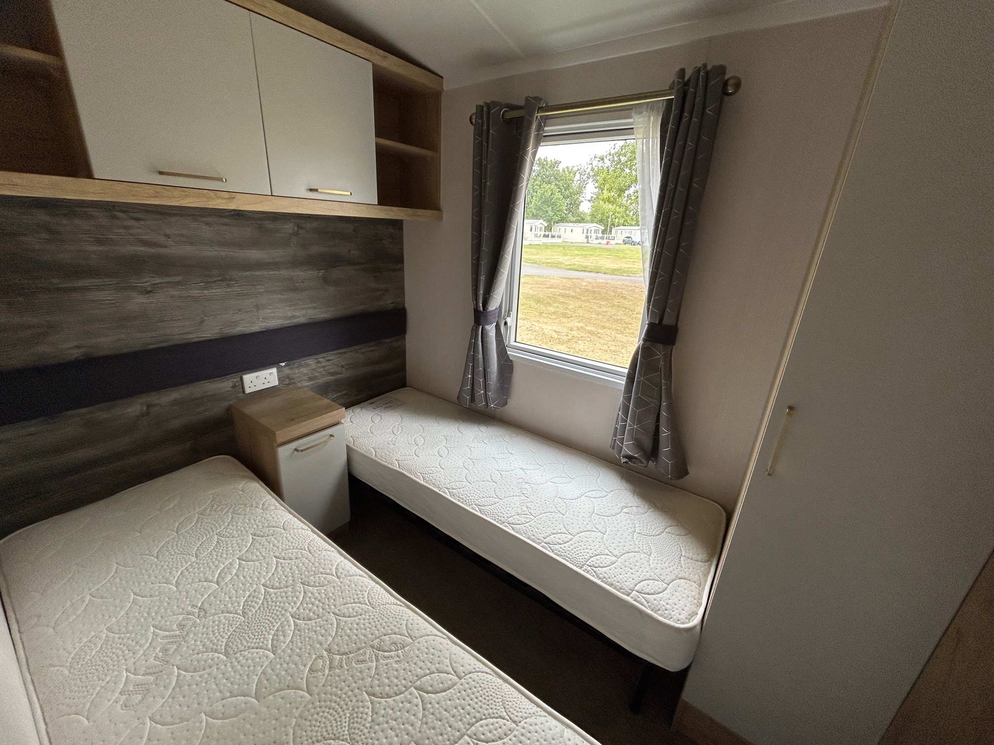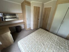 In the main bedroom, the double bed has comfortable mattress, a contemporary and stylish padded headboard and over-bed reading lights. The en-suite has a WC and wash basin adding a little privacy for the main bedroom users. For storage, the bed lifts up for under-bed storage plus there are bedside cabinets, over-bed storage plus a double wardrobe at the end of the bed. Also, there is a vanity area with mirror for getting ready for an evening out.